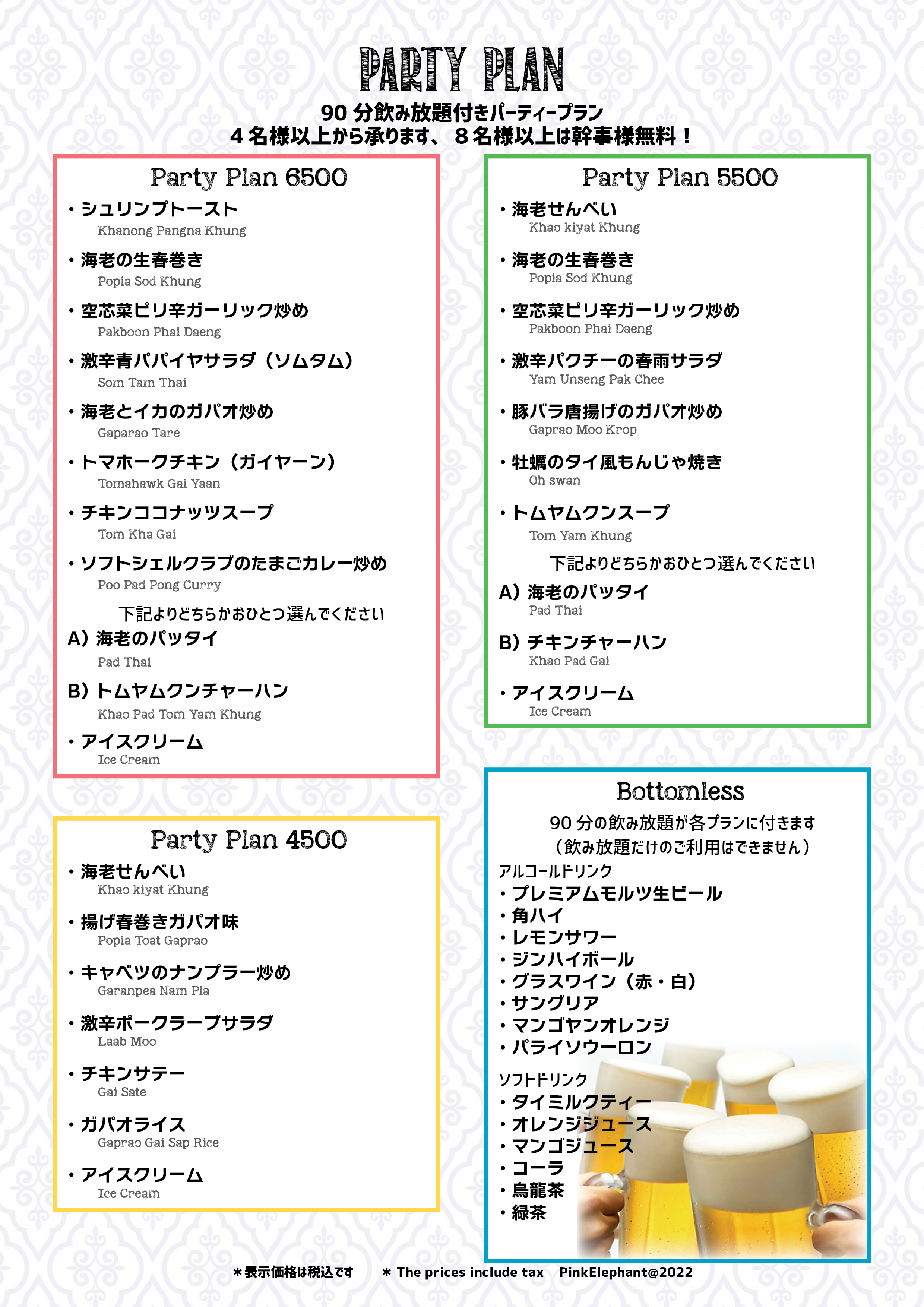 パーティープラン 4名様以上、要予約、ディナータイムに限ります