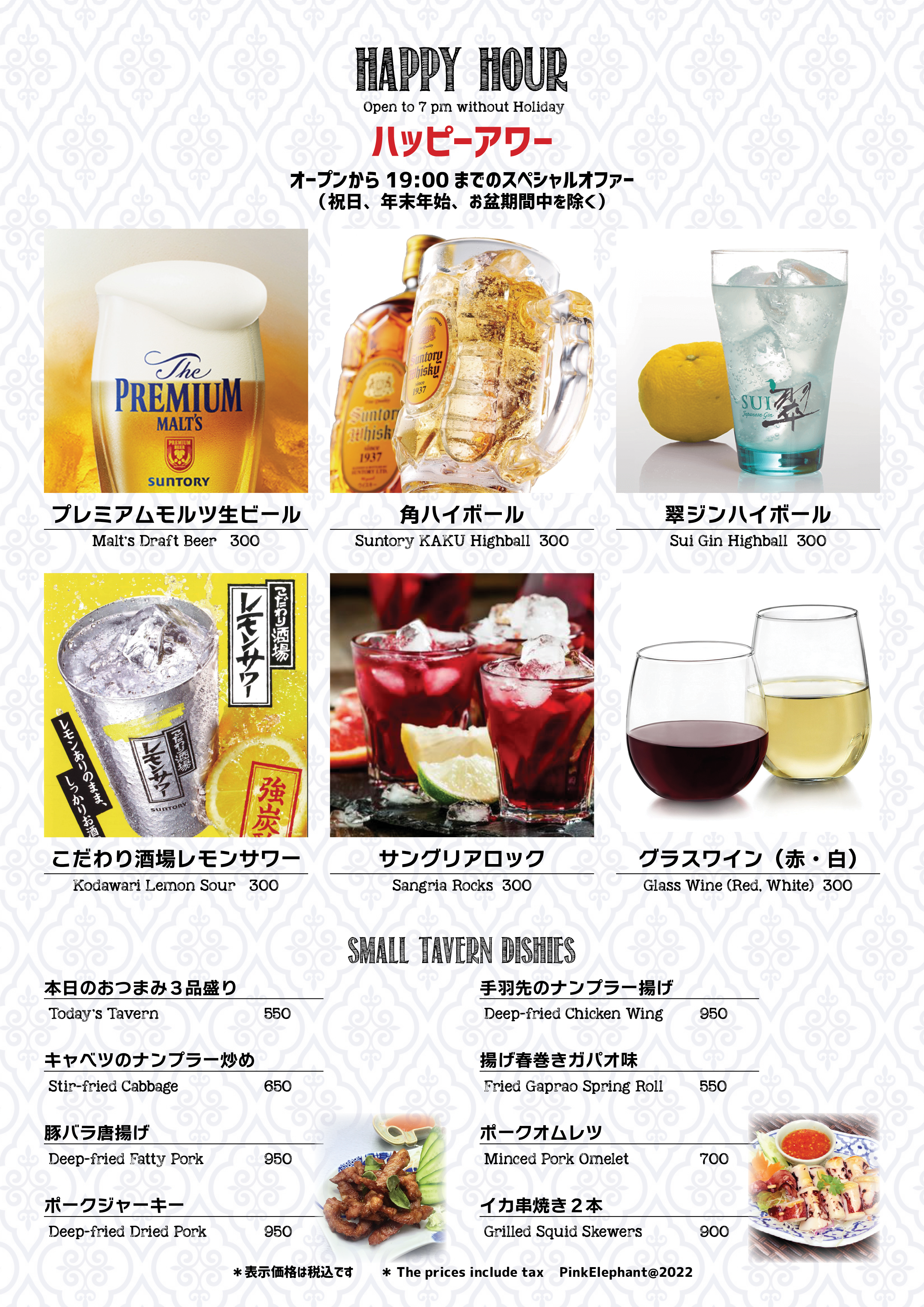 ハッピーアワーメニュー 月曜日から金曜日17:30 - 19:00 祝日、年末年始やお盆期間中を除く